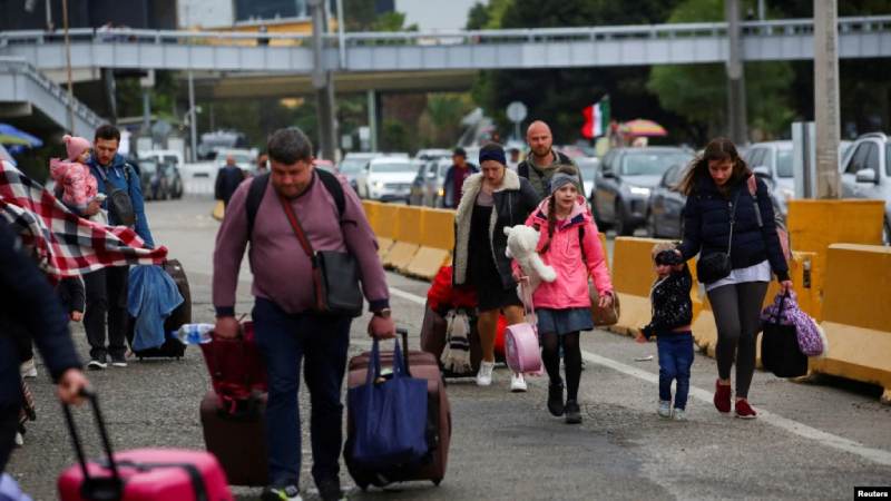 Ucranianos que huyeron a México en medio de la invasión de Rusia a su patria, caminan con sus pertenencias para cruzar el puerto de entrada terrestre de San Ysidro en la frontera entre Estados Unidos y México, en Tijuana, México, el 2 de abril de 2022 / Foto: Reuters.
